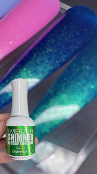 Directions: Apply One Coat of Emerald Shimmer Glossy Top Coat over entire nail. Top Coat can also be used over any gel polish. Cure 1 Minute in LED or 2 Minutes in UV Lamp.